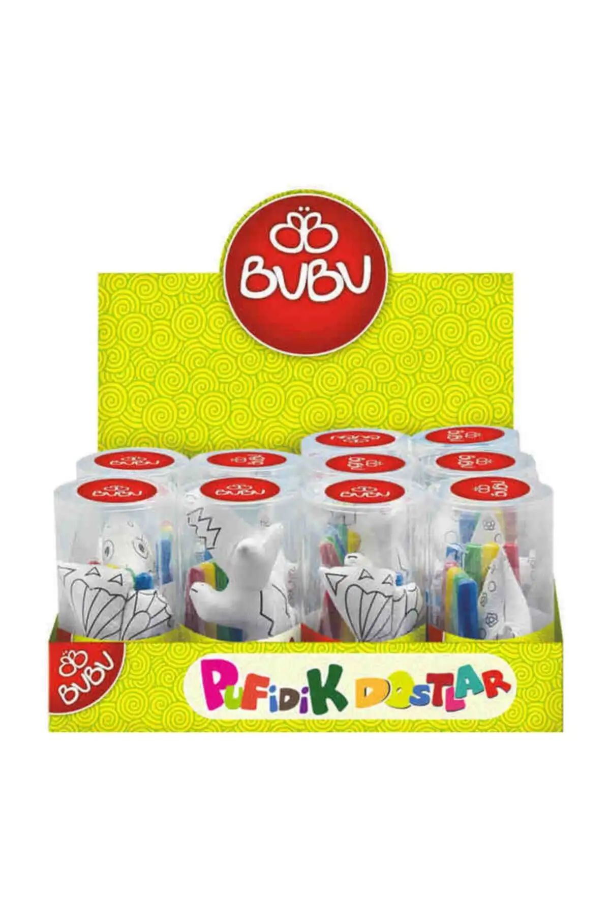 • Ürün paketi içerisinde 1 adet pufidik maskot, 4 adet farklı renkte su